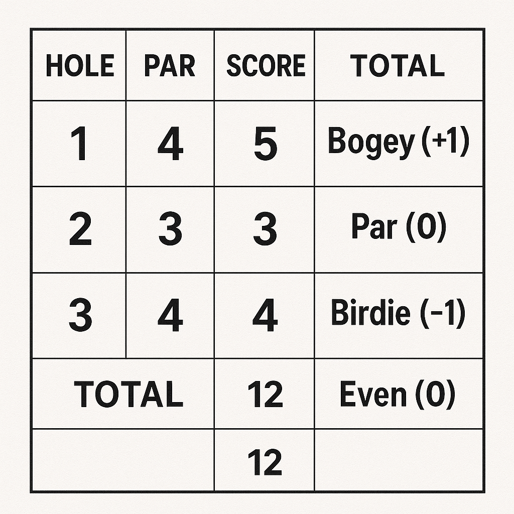 • 1번 홀: Par 4 → 실제 타수 5 → 보기 (+1)