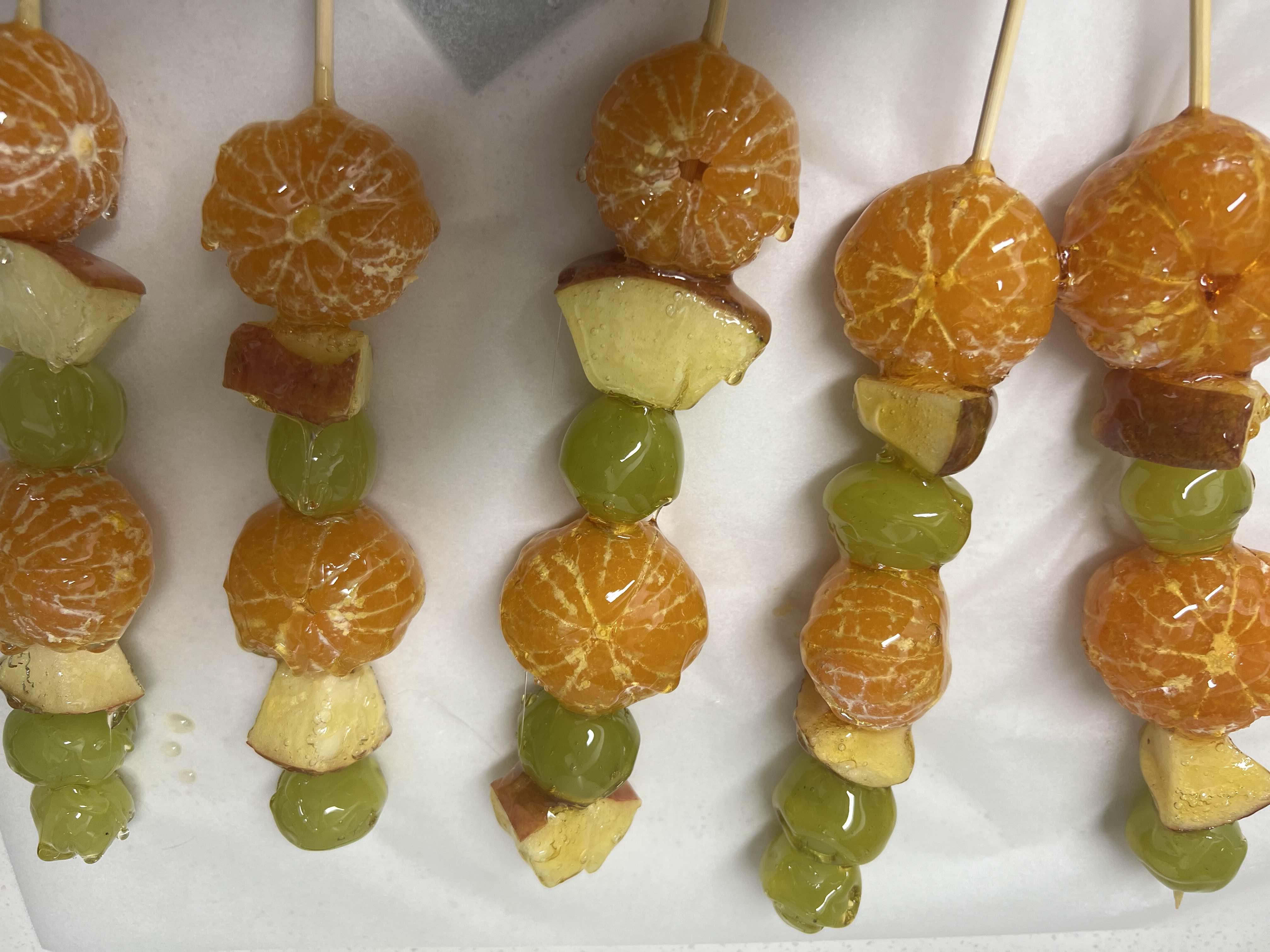 꼬치에 끼워둔 과일에 골고루 발라주면 완성됩니다.