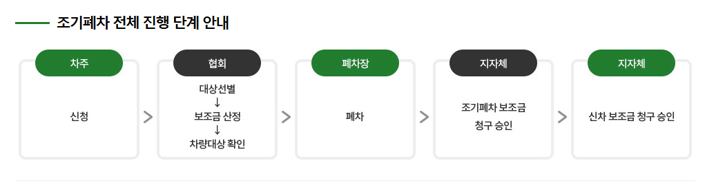 • 신청 시점: 조기폐차 신청 전에 신차 또는 중고차를 구매할 당시, 조기폐차 신청 대상 차량을 소유하고 있어야 추가 보조금 지원이 가능합니다.